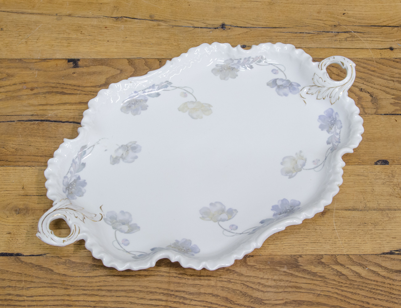 Антикварное фарфоровое блюдо в стиле Модерн Вероятно изготовлено в конце 19-го или начале 20-го века Клеймо отсутствует, но предмет напоминает работы Фрауройт или Кузнецовского фарфорового завода. Деколь и позолота местами стерты